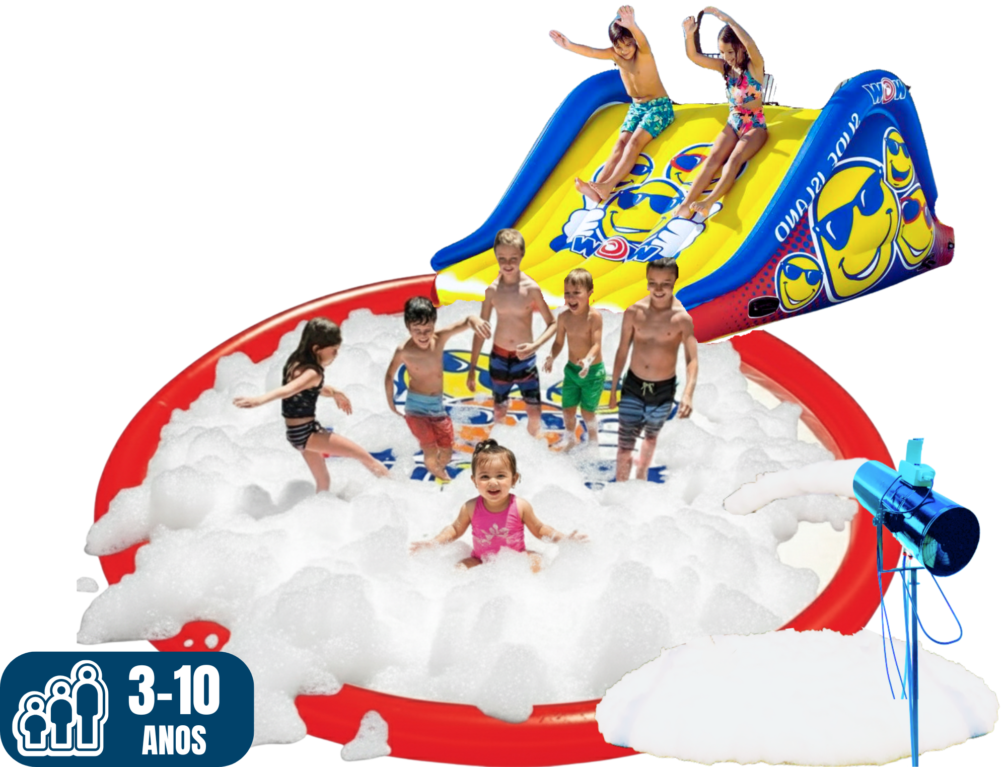 O Banho de Espuma no Parque Wow é a receita perfeita para refrescar a criançada nos dias de calor! Com um mini-toboágua para deslizadas emocionantes e um piso circular Splash Pad para brincadeiras na espuma, a diversão é garantida. Super refrescante. O Canhão de Espuma cria um ambiente mágico e cheio de bolhas! A espuma é derramada sobre a lona!. A locação inclui shampoo infantil de qualidade com cheiro muito agradável (não arde nos olhos!), adicionado de hidratante líquido para melhor sensação e frescor nos participantes.
