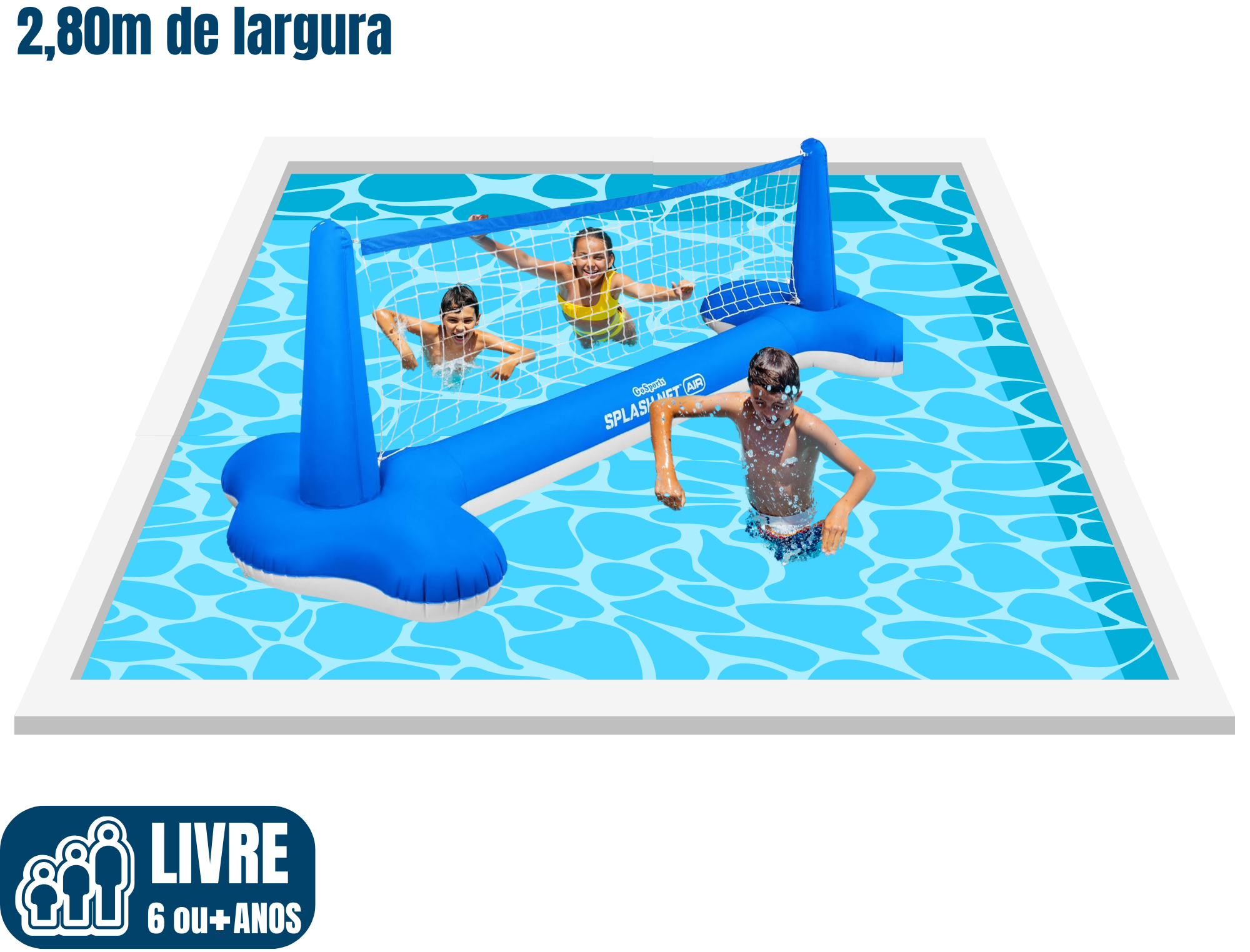 Que tal uma partida de vôlei refrescante com a galera? O Vôlei Inflável Splash Net te oferece 2,8 metros de pura diversão aquática! Pegue a bola macia e chame seus amigos e amigas para um jogo animado e seguro dentro da piscina!