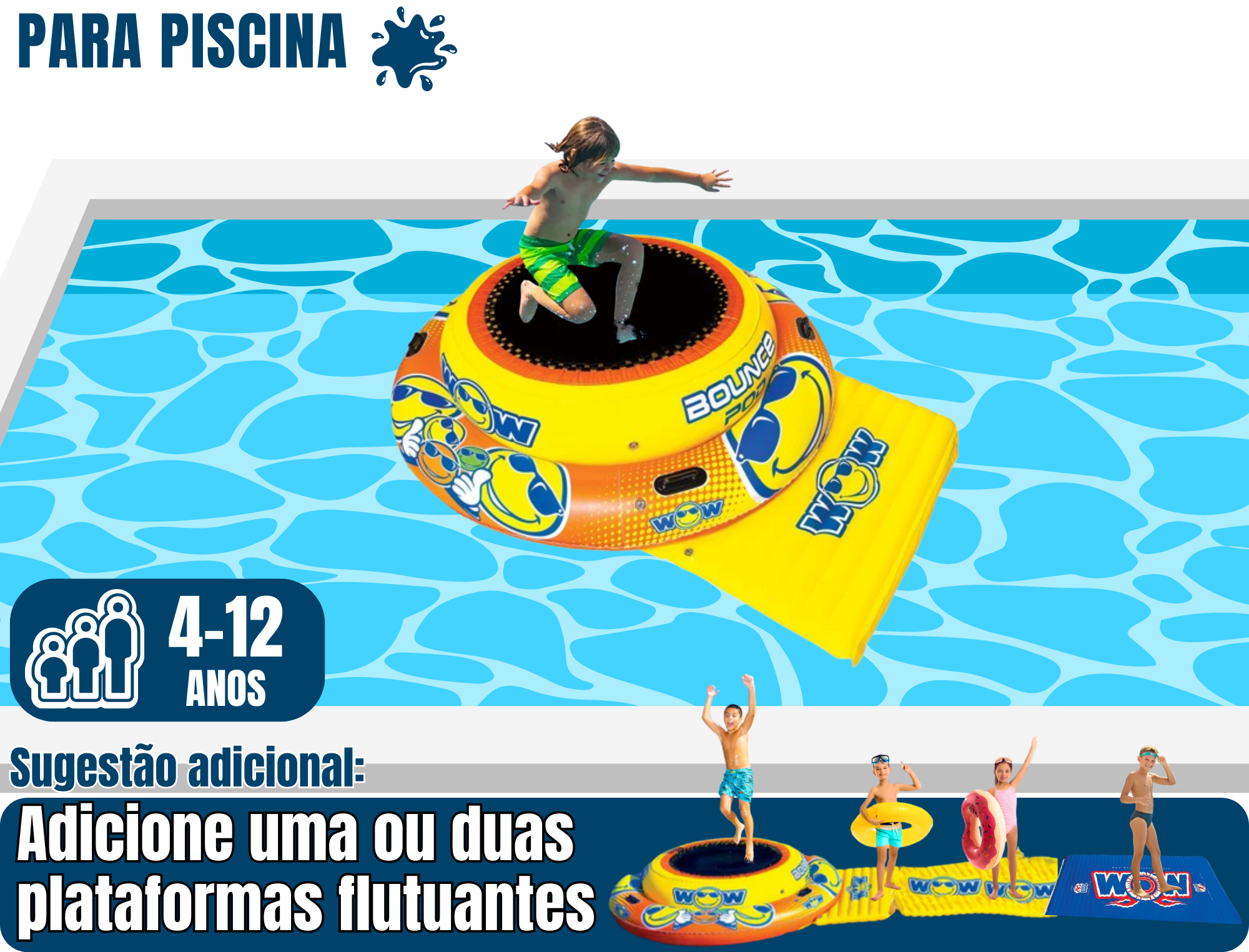 A diversão na piscina acaba de ganhar um toque exclusivo com o Trampolim Aqua Jump Wow (Bounce Pod)! Seguro para todas as crianças, este inflável flutuante é perfeito para animar a turminha. Que tal um desafio extra? Combine-o com plataformas flutuantes para criar uma emocionante "Ponte do Rio que Cai", onde pular e manter o equilíbrio são a chave da diversão!
