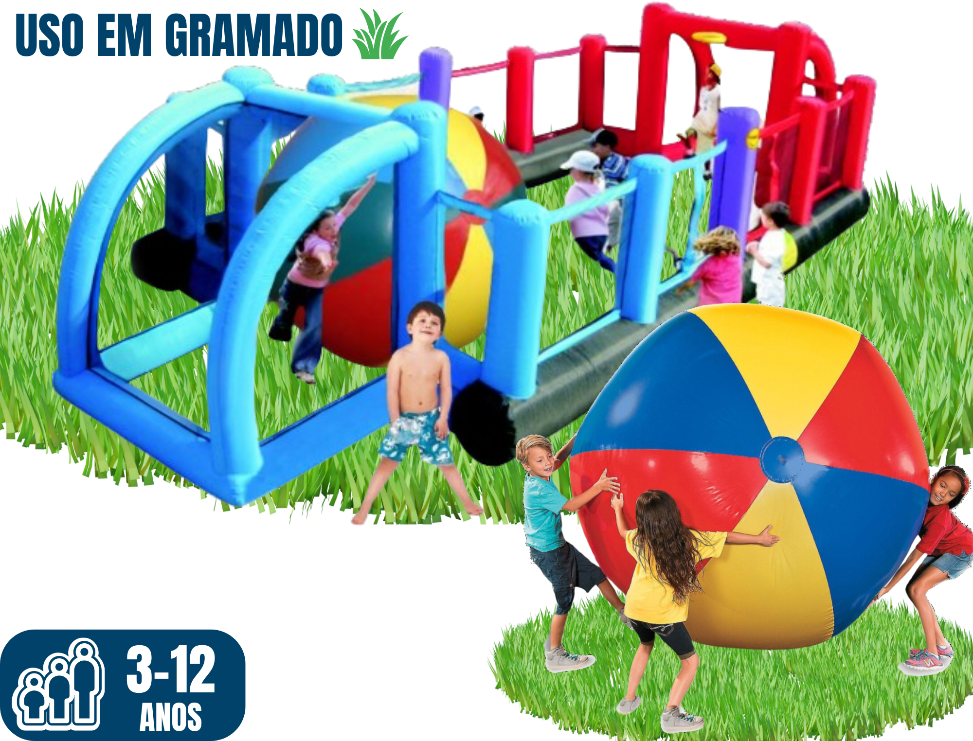 O Mini-Futebolão é perfeito para a diversão da garotada! Com cores vibrantes que encantam, ele pode ser instalado em quadras, pisos de cerâmica ou qualquer tipo de gramado (sintético ou natural). Para garantir a brincadeira completa, levamos não só uma bola normal, mas também um "bolão" gigante. Se o local for na grama, usamos estacas plásticas para prendê-lo, garantindo a segurança e estabilidade, mesmo em dias com vento.