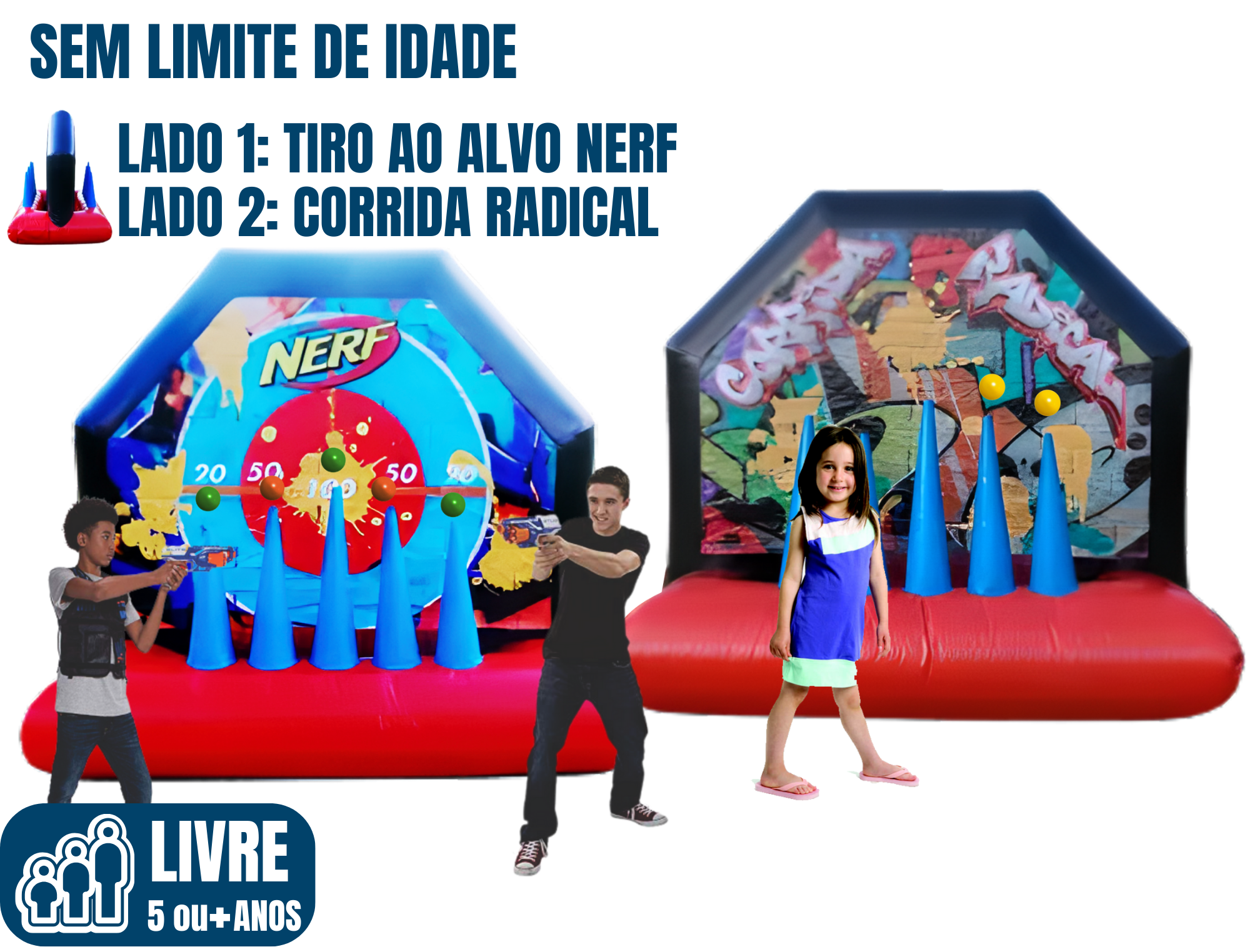 A diversão é garantida em dose dupla com o incrível Dual Nerf 2 em 1! De um lado, prepare sua Nerf para acertar as bolinhas que flutuam no ar no super divertido Jogo Tiro ao Alvo. Do outro, entre na pista da Corrida Radical e mostre sua habilidade equilibrando as bolinhas flutuantes entre os cones de ar. E que tal uma corrida emocionante com um amigo? Dois participantes podem competir ao mesmo tempo! Este super-brinquedo é a atração que o seu evento precisa!