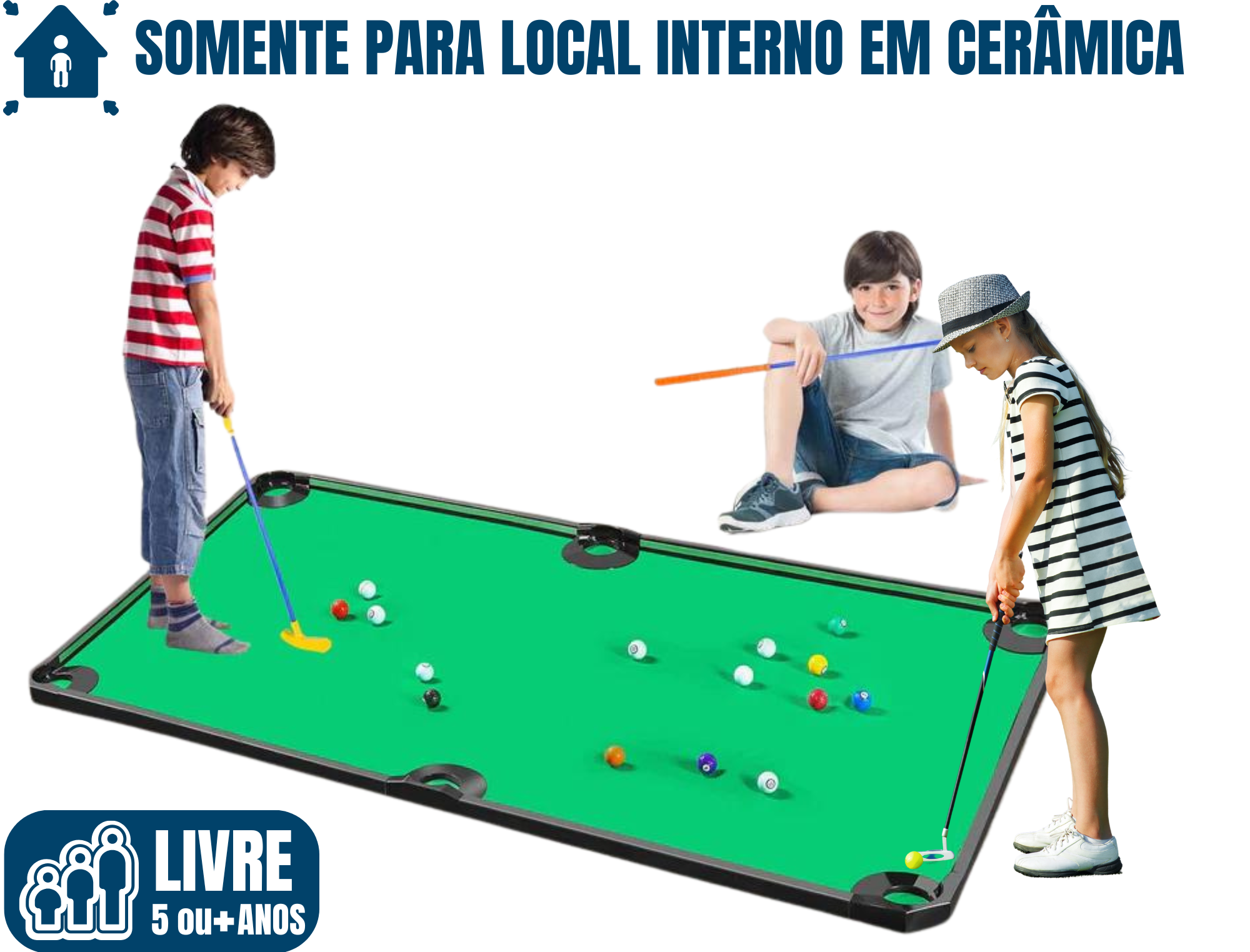 Prepare-se para uma experiência inédita com o Golf Indoor! Este conjunto exclusivo combina a emoção do golfe indoor com a dinâmica envolvente da sinuca, tudo em um tapete no chão. Perfeito para todas as idades, o Golf Indoor oferece um desafio estimulante com seus dois tacos, 16 bolas de golfe numeradas ao estilo bilhar, seis caçapas e um tapete verde vibrante.