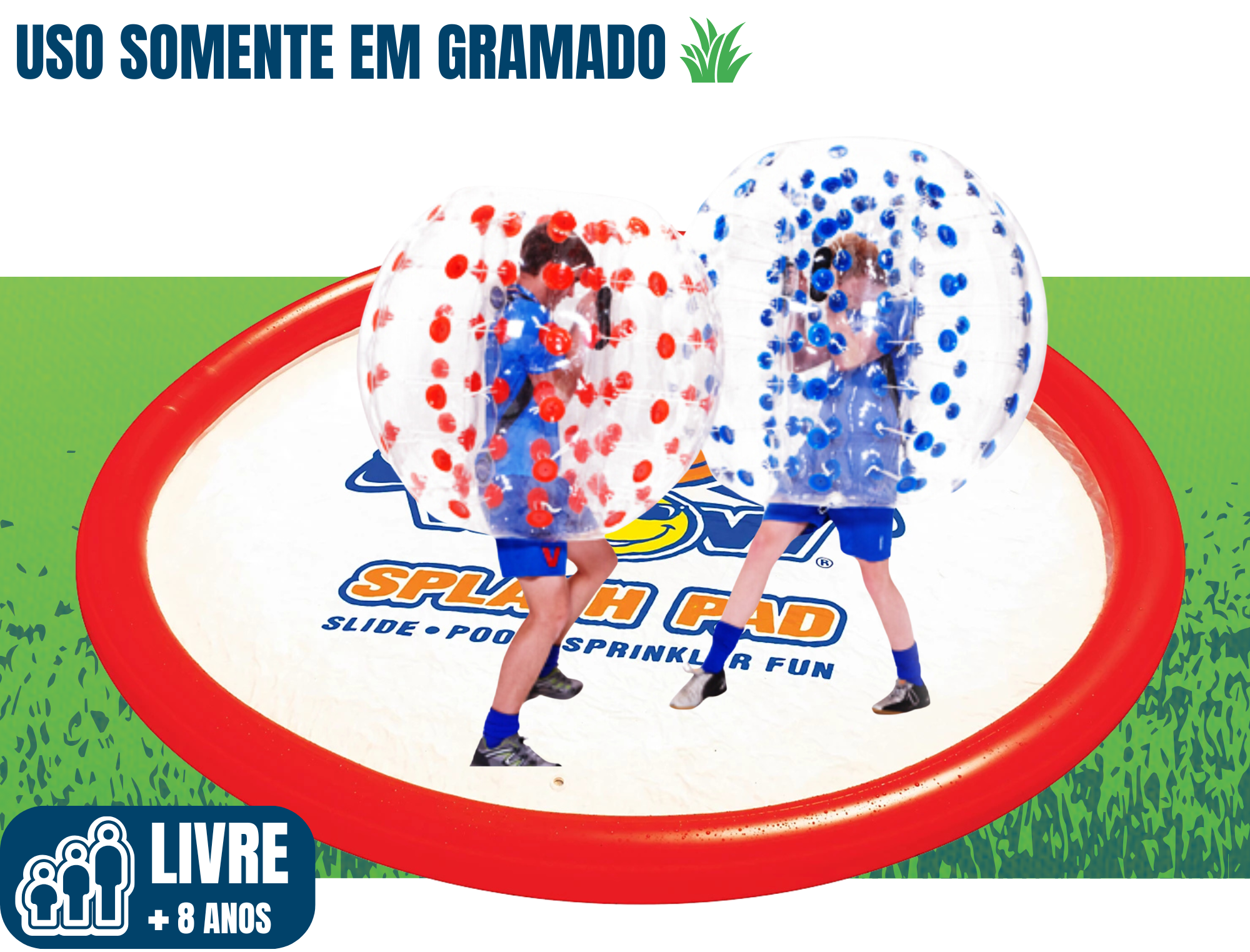 Que tal uma luta de sumô em bolhas gigantes? Para crianças e adultos! O Sumô Ball ou Guerra com Bolhas é pura diversão no Splash Pad Wow! Para garantir a melhor experiência, faça a brincadeira em grama normal sem terra ou grama sintética. Prepare-se para empurrar seus amigos para fora da área inflável em uma competição totalmente segura e que vai gerar muitas risadas!