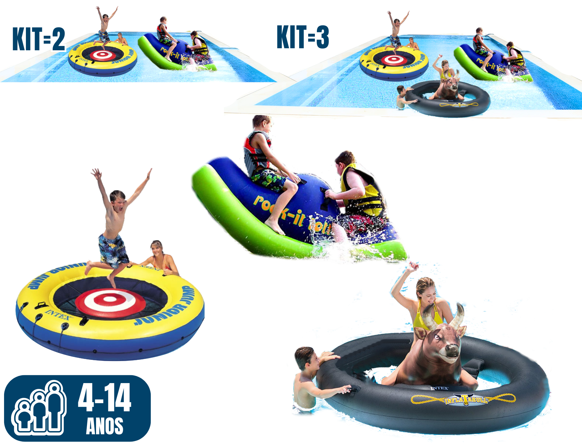 A diversão é multiplicada com o Junior Jump! Disponível em duas unidades, este brinquedo inflável para crianças de 4 a 14 anos (até 68kg) em piscinas grandes funciona como trampolim em formato de boia, esconderijo subaquático, apoio para flutuação e plataforma para pequenos saltos! Use a imaginação e crie suas próprias brincadeiras aquáticas! Tamanho: 2,5m (diâmetro) x 0,7m (altura) (cada).
